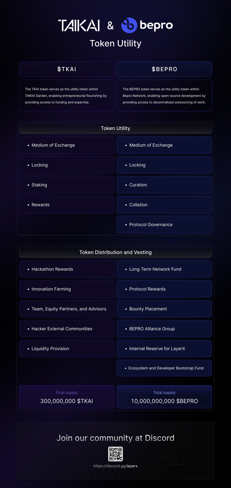 Recently, we've announced the revamp of $TKAI and its utility in the TAIKAI Garden, thereby introducing our second on-chain token alongside $BEPRO. Each of our tokens plays a crucial role in the LayerX ecosystem.