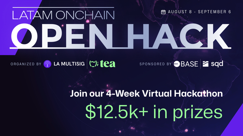 LATAM Onchain Open Hack is a global hackathon focused on the LATAM community, co-hosted by @tea Protocol and @La Multisig and sponsored by @Base and @Subsquid.
